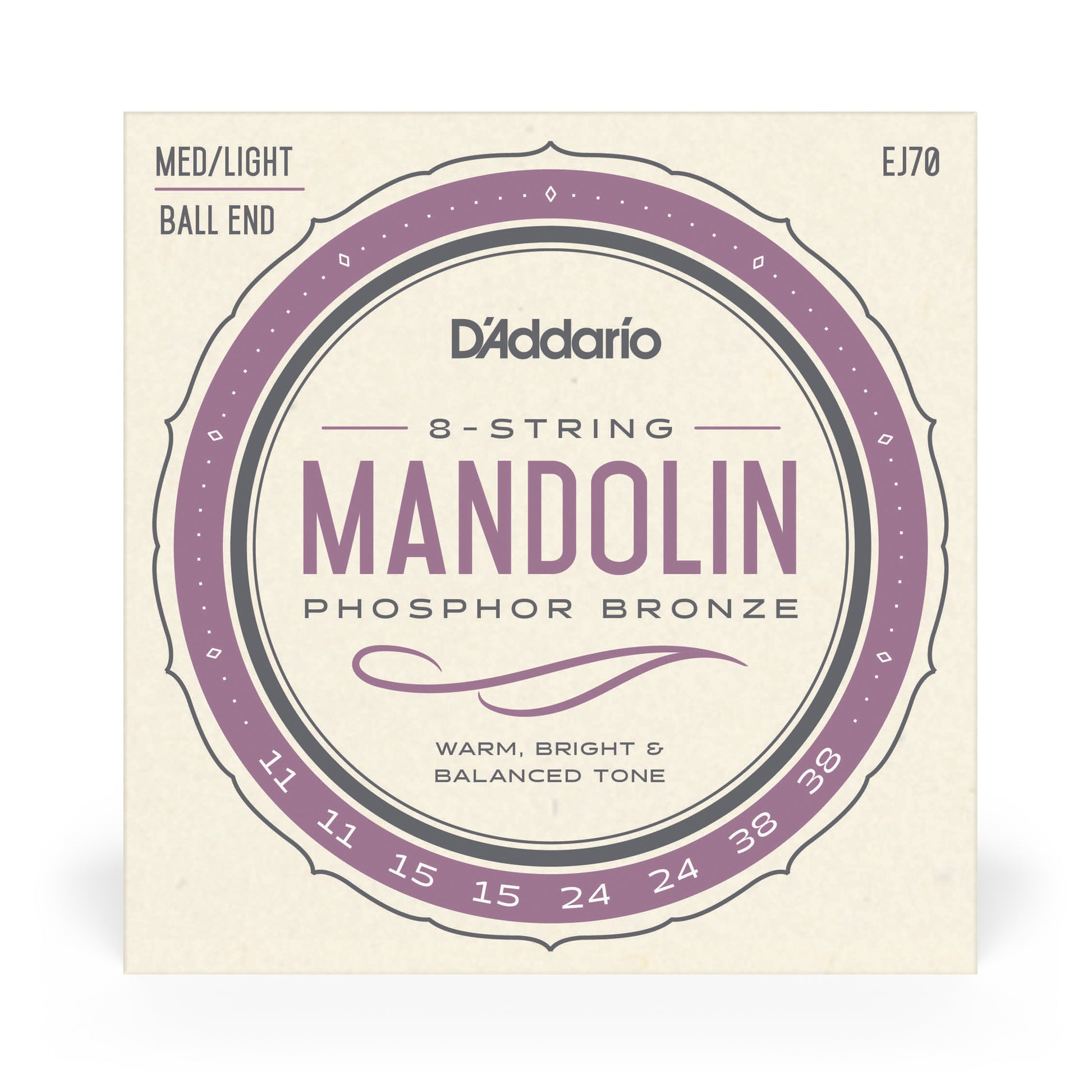 EJ70, D'Addario's mandolin set featuring ball ends rather than standard loop ends are ideal for all mandolins requiring ball ends. EJ70's contain the E and A strings from a medium gauge mandolin set with the slightly lighter D and G strings from a light gauge set. Phosphor Bronze construction provides an ideal balance of warmth, brightness and overall balanced tone.