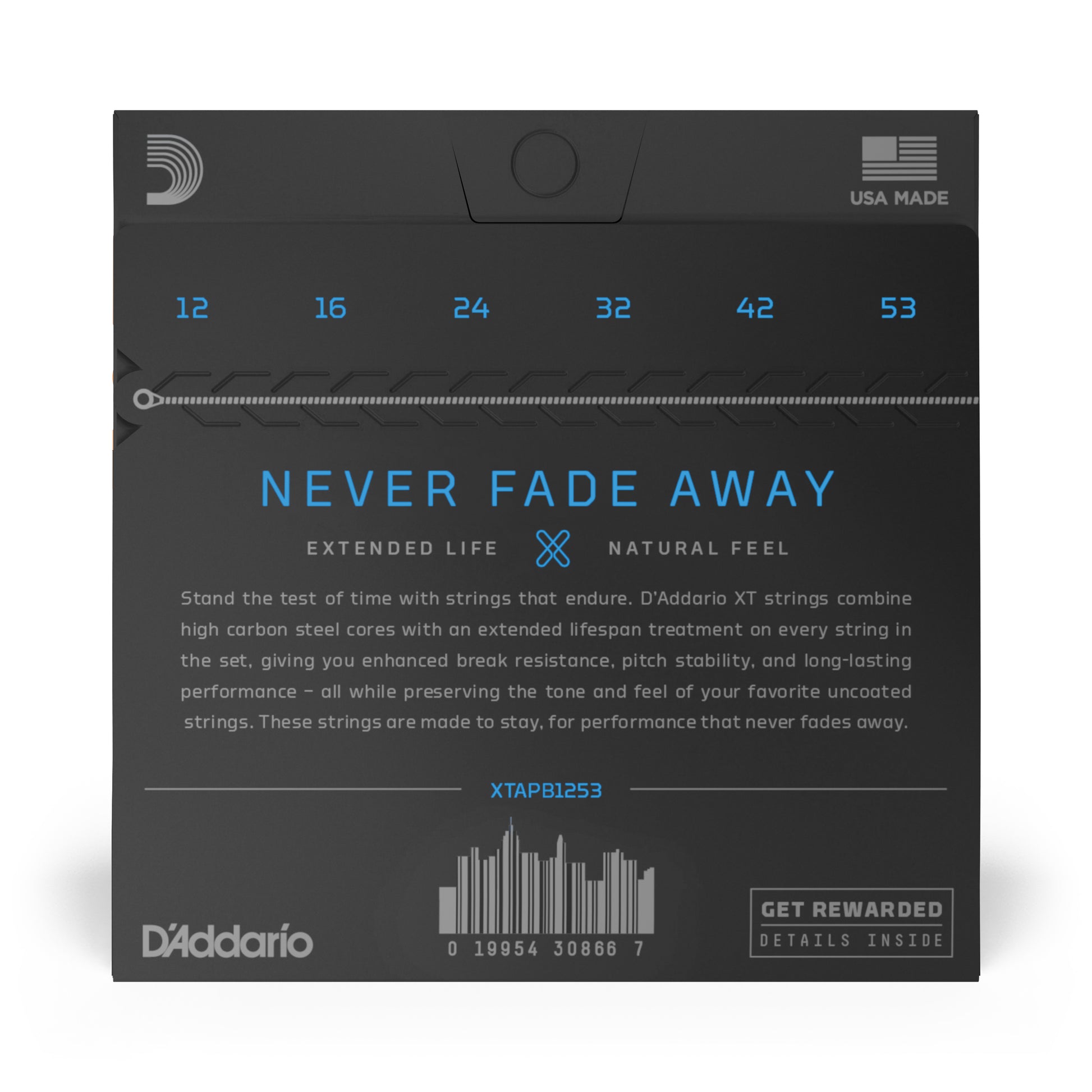 Since D'Addario introduced Phosphor Bronze acoustic guitar strings in 1974, they've been synonymous with warm, well-balanced tone. XT Phosphor Bronze offers that and more, boasting enhanced break resistance, better pitch stability, and longer life than our standard phosphor bronze strings. The XT coating delivers advanced corrosion resistance, while still retaining the warm tone and natural feel of the uncoated string. Beneath the coating, these XT acoustic strings are constructed with a NY Steel core, phosphor bronze wrap wire, and Fusion Twist technology, affording tonal versatility with added resilience, excellent for a wide range of acoustic styles. 12-53 Light strings are our most popular acoustic gauge, providing a nice balance of playability and tone.
