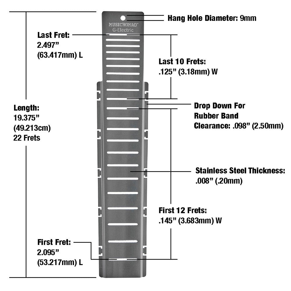 - The tapered custom design has slot sizes that measure in width for the first 12 frets .145" (3.683mm) due to creative fret placement by guitar makers, and the remaining 10 frets are .125" (3.18mm). First fret Length: 2.095" (53.217mm). Last fret Length 2.497" (63.417mm). Fits all fret sizes (from narrow to jumbo) found on 6 string guitars.